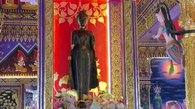 นายทอง คำเยี่ยม มรรคทายกวัดบ้านด่าน กล่าวว่า หลวงพ่อทองเป็นพระพุทธรูปปางห้ามสมุทร หรือปางห้ามญาติ อัญเชิญมาจากกรุงเทพมหานคร มาประดิษฐานที่วัดบ้านด่าน ตั้งแต่ ปี พ.ศ.2495 พุทธศาสนิกชนทั่วไปให้ความเคารพศรัทธาเป็นอย่างยิ่ง เคยถูกโจรกรรมไปถึง 2 ครั้ง แต่ก็ไม่สามารถนำท่านไปได้ ชาวบ้านด่านตามหาจนพบและนำกลับมาประดิษฐานที่วัดบ้านด่านเช่นเดิมทุกครั้ง ทำให้กิตติศัพท์และเมตตาบารมีของหลวงพ่อทองขจรขจายเป็นที่กล่าวถึงในวงกว้าง และเพื่อป้องกันการโจรกรรม ชาวบ้านด่านจึงได้ทำกรงเหล็ก นำหลวงพ่อทองไปประดิษฐานไว้ตั้งแต่นั้นมา ต่อมา นายขจรศักดิ์ ศรีบุญเรือง ลูกหลานชาวบ้านด่านที่ไปประกอบสัมมาชีพที่กรุงเทพมหานคร ได้กลับมาอธิษฐานขอเมตตาบารมีจากหลวงพ่อทองว่า ถ้าทำมาค้าขาย ธุรกิจเจริญรุ่งเรือง จะกลับมาสร้างวิหาร เพื่อนำหลวงพ่อทองออกจากกรง คำอธิษฐานเป็นจริงดังตั้งใจ ดังนั้นในปี พ.ศ.2553 นายขจรศักดิ์ ศรีบุญเรือง จึงได้รวบรวมปัจจัยมาตั้งต้นก่อสร้างวิหาร พร้อมทั้งได้รับแรงศรัทธาจากญาติมิตรและพุทธศาสนิกชน ร่วมสมทบทุนก่อสร้างวิหารหลวงพ่อทองอย่างต่อเนื่อง และเสร็จสมบูรณ์เมื่อปี พ.ศ.2566 จึงได้อัญเชิญหลวงพ่อทองขึ้นประดิษฐานไว้บนวิหารหลวงพ่อทองต่อไป