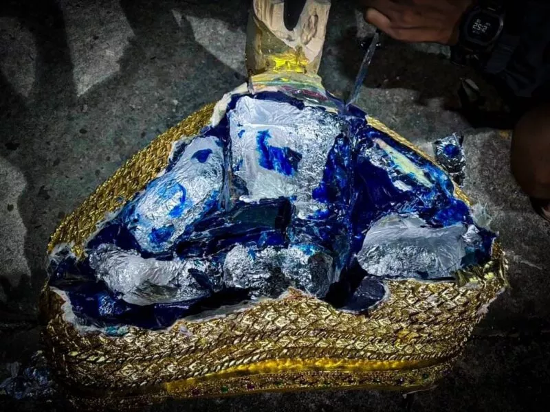 โดยเมื่อ วันที่ 16 พ.ย.67 เวลา 22.00 น. ชุดปราบปรามยาเสพติด กองร้อยเฉพาะกิจตำรวจตระเวนชายแดนที่ 237 ได้รับแจ้งจากชาวบ้านที่กำลังจะออกไปกรีดยางว่าพบเห็นพระพุทธรูป จำนวน 3 องค์ ที่ถูกวางไว้ข้างทางห่างจากแหล่งชุมชนหมู่บ้านพอสมควร บริเวณทางเข้าหมู่บ้านดอนแดงน้อย ต.ท่าจำปา อ.ทำอุเทน จ.นครพนม เป็นที่น่าสงสัย จึงรีบแจ้งต่อเจ้าหน้าที่ฯ เพื่อให้นำไปตรวจสอบและคาดว่าอาจจะมียาเสพติดซุกซ่อนอยู่ภายใน เมื่อเข้าไปสำรวจตรวจสอบเบื้องต้นพบว่ามียาเสพติดที่มีลักษณะวางซุกซ่อนในองค์พระพุทธรูปเป็นจำนวนมากจริง ก่อนถูกหล่อด้วยน้ำยาเรซิ่นอยู่ภายใน แต่อย่างไรก็ตามทางเจ้าหน้าที่ยังคงวางกำลังดักซุ่มรอ เพื่อหวังจะมีผู้มารับพระจำนวนดังกล่าวจนกระทั่งถึงเช้า เมื่อไม่มีผู้ใดมารับหรือแสดงตัวเป็นเจ้าของ จึงได้ทำการตรวจยึดและนำพระพุทธรูปทั้ง 3 องค์ มายังกองร้อยเฉพาะกิจตำรวจตระเวนชายแดนที่ 237 เพื่อทำการตรวจสอบอย่างละเอียด