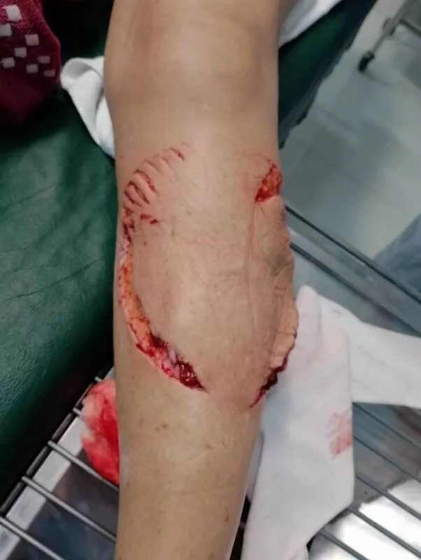 โดนปลาไม่ทราบชนิดกัดบริเวณขาได้รับบาดเจ็บเป็นแผลฉีกขาดขณะลงไปเล่นน้ำทะเล ที่ความลึกประมาณ 1.50 เมตร