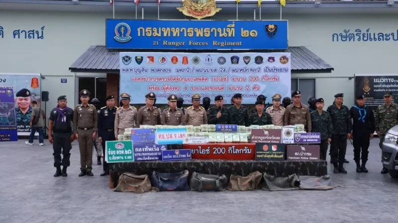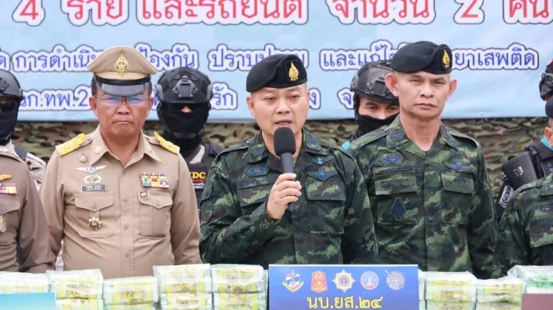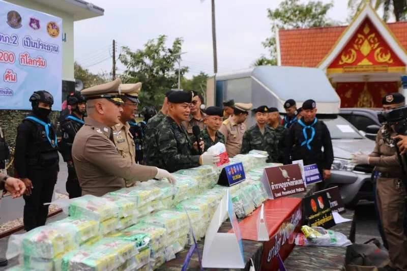แม่ทัพภาค 2 แถลงข่าวการจับกุมผู้ต้องหา 4 ราย พร้อมของกลาง ไอซ์ จำนวน 6 กระสอบน้ำหนัก 200 กก. มูลค่า 200 ล้านบาท ในพื้นที่ อ.ปากชม จ.เลย
