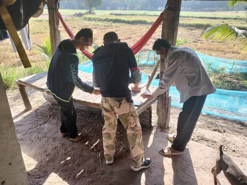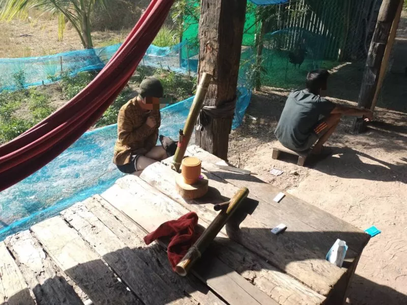 ในที่เกิดเหตุ พบกลุ่มบุคคลมีพฤติกรรมต้องสงสัย ได้แสดงอาการพิรุธ จำนวน 4 คน เจ้าหน้าที่จึงทำการตรวจหาสารเสพติดในร่างกาย ผลปรากฏเป็นผลบวกจำนวน 3 คน และทำการตรวจค้นบริเวณกระท่อมนา และบริเวณโดยรอบพบอุปกรณ์การเสพติด (ยาบ้า) และอาวุธปืนยาวไทยประดิษฐ์ จำนวน 1 กระบอก ซุกซ่อนไว้ในห้องนอนของเจ้าของกระท่อมนา (ซึ่งตรวจร่างกายไม่พบยาเสพติด) จึงนำตัวผู้ต้องหาทั้งหมดพร้อมของกลางมาดำเนินการตามกฎหมายต่อไป