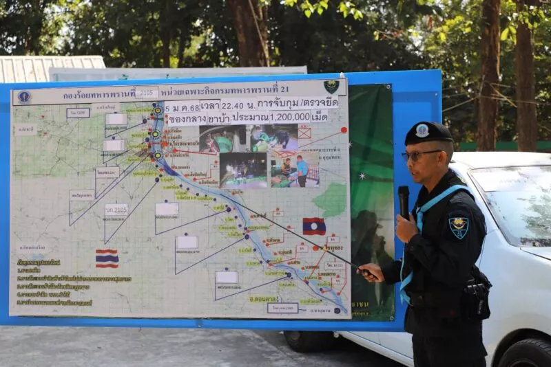 นายจิรายุทธ สุพร ผู้ขับ(ทราบชื่อภายหลัง) จนสามารถควบคุมตัวบุคคลดังกล่าวได้ ณ จุดสกัด บ.นาโก ต.กุดแข้ อ.เมืองมุกดาหาร ในส่วนรถยนต์ โตโยต้าวีโก้ ทะเบียน บฉ 6208 นครพนม ซึ่งเป็นรถบรรทุกยาเสพติด คนขับได้ขับรถพุ่งชนฝ้ารถสกัดกั้นบริเวณดังกล่าวหลบหนีไป จนกระทั่งเวลา 22.40 น.เจ้าหน้าที่ สามารถได้ไล่ติดตามเข้าสกัดรถยนต์ดังกล่าวได้ที่บริเวณ บ.สงเปือย ม.6 ต.บ้านโคก อ.เมืองมุกดาหาร จังหวัดมุกดาหาร (พิกัด VD ๕๕๗ ๓๖๐) ซึ่งตรวจพบผู้ต้องสงสัยเป็นชาย 1 คน คาดว่าเป็นผู้ขับรถยนต์คันดังกล่าว กำลังวิ่งหลบหนีเข้าไปในหมู่บ้าน เมื่อตรวจสอบภายในรถพบกระสอบบรรจุยาบ้าจำนวน 6 กระสอบ แต่ละกระสอบพบว่าบรรจุยาบ้า 100 มัด แต่ละมัดมีประมาณ 2,000 เม็ดรวมของกลางยาบ้าประมาณ 1,200,000 เม็ด ปัจจุบัน ได้นำของกลาง และ ผู้ต้องหา มายัง กองร้อยเฉพาะกิจทหารพรานที่2105 เพื่อสอบสวนขยายผล และตรวจนับของกลางอย่างละเอียด