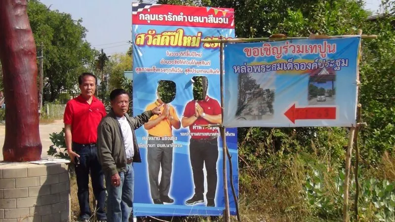 ต่อมาผู้สื่อข่าวได้ลงพื้นที่บริเวณข้างโรงเรียนบุ่งอุทัย ตำบลนาสีนวน พบนาย สมหมาย แข็งแรง อดีตนายกองค์การบริหารส่วนตำบลนาสีนวน อำเภอเมือง จังหวัดมุกดาหาร ผู้แจ้ง และได้บอกว่า ในกรณีป้ายอวยพรปีใหม่ อดีตผมเคยเป็นนายก อบต.นาสีนวนมาแล้ว แต่ก่อนต้องรองบประมาณจากส่วนกลาง และได้กระจายมาสู่ท้องถิ่น ผมก็อยากทำสิ่งที่ดีให้กับตำบลนาสีนวน แต่ในขณะนี้เดี๋ยวนี้ ผมไม่ได้ลงสมัครรับเลือกตั้ง แต่ในนามกลุ่มเรารักตำบลนาสีนวน ใกล้จะสิ้นปีแล้วก็เลยทำป้ายอวยพรปีใหม่ ให้พี่น้องตำบลนาสีนวน ให้อยู่ดีมีสุขหมดทุกคน ไม่ได้เสียดสีใคร ใส่ร้ายผู้ใด คิดอย่างเดียวว่า ใครก็ชั่งที่ทำแบบนี้แล้ว ความคิดของคนต่างคนต่างคิด ก็ไม่เป็นไร สุดท้ายคือการตัดสินใจของพี่น้องประชาชนตำบลนาสรนวนของเรา และได้ไปลงบันทึกประจำวันไว้แล้วที่ สภ.เมืองมุกดาหาร