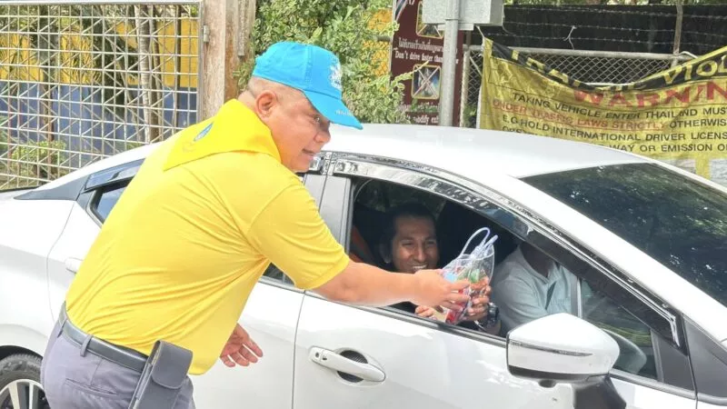 วันที่ 12 เมษายน 2568 – ผู้สื่อข่าวรายงานว่า พ.ต.อ.เจริญพงษ์ ขันติโล ผู้กำกับการด่านตรวจคนเข้าเมืองจังหวัดสตูล พร้อมด้วย พ.ต.ท.ระลึก อินทรัศมี รอง ผกก.ตม.สตูล และเจ้าหน้าที่ในสังกัด ตม.สตูล ได้ร่วมกันแต่งชุดจิตอาสา จัดกิจกรรมมอบน้ำใจ แจกน้ำดื่มและขนม ให้แก่นักท่องเที่ยวชาวไทยและชาวมาเลเซีย ที่เดินทางเข้ามาท่องเที่ยวผ่านด่านชายแดนวังประจัน อ.ควนโดน จ.สตูล เนื่องในช่วงเทศกาลสงกรานต์