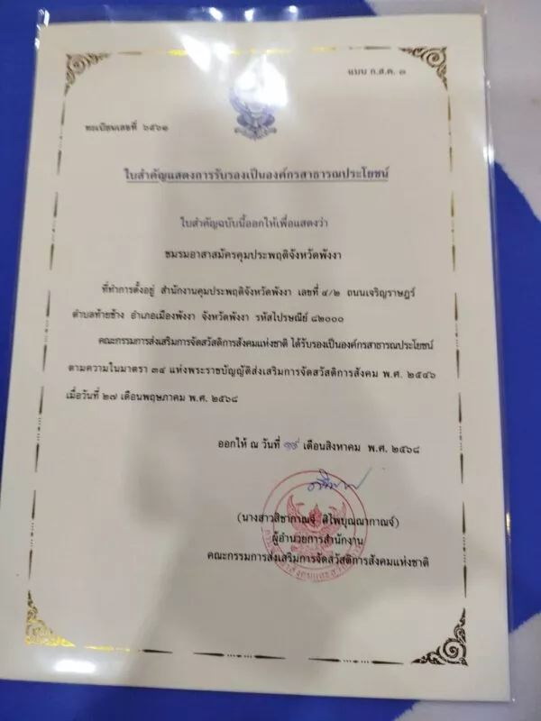 ชมรมอาสาสมัครคุมประพฤติจังหวัดพังงา ได้เฮ… จดทะเบียนเป็นองค์กรสาธารณประโยชน์ อย่างเป็นทางการ เพิ่มศักยภาพการทำงานของชมรมฯ