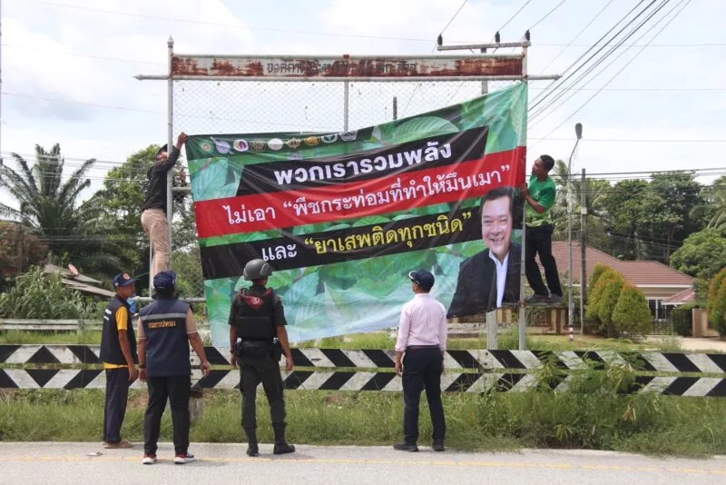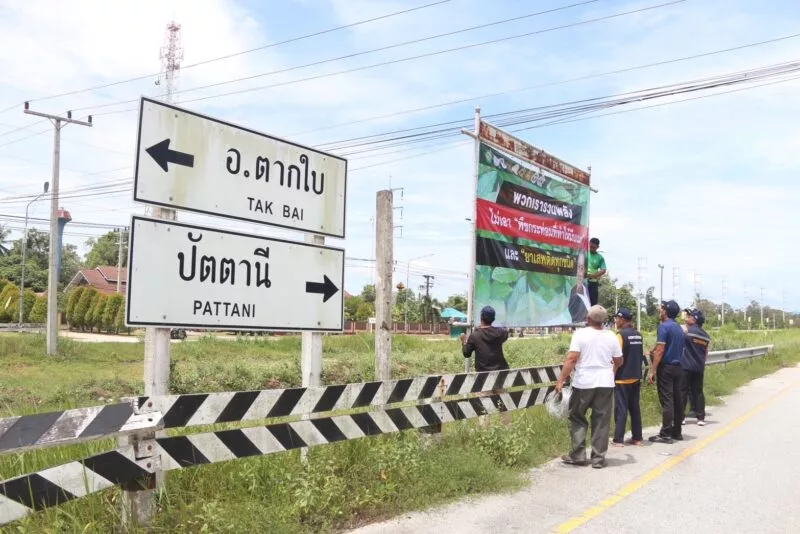 วันที่ 4 กันยายน 2568 ผู้สื่อข่าวรายงานว่า นายสายนูดิน มามุ นักวิเคราะห์นโยบายและแผนชำนาญการพิเศษ หัวหน้างานคุ้มครองสิทธิเสรีภาพและอำนวยความเป็นธรรม กองส่งเสริมและสนับสนุนงานพัฒนาความมั่นคง ศูนย์อำนวยการบริหารจังหวัดชายแดนภาคใต้ (ศอ.บต.) พร้อมด้วยผู้นำศาสนา ผู้นำชุมชน ผู้นำท้องถิ่น ชาวบ้านตำบลกะลุวอ อ.เมือง จ.นราธิวาส องค์การบริหารส่วนตำบล ตำรวจในพื้นที่ ได้ร่วมกันเปิดปฏิบัติการรณรงค์ “พวกเรารวมพลังไม่เอาพืชกระท่อมที่ทำให้มึนเมาและยาเสพติดทุกชนิด” โดยการนำป้ายรณรงค์มาติดตั้งที่บริเวณถนนสายเลี่ยงเมืองนราธิวาส–ตากใบ ซึ่งเป็นเส้นทางหลักที่นักท่องเที่ยวชาวมาเลเซียใช้ผ่านเข้าสู่อำเภอเมือง โดยก่อนหน้านี้เคยมีการซื้อขายน้ำกระท่อมบริเวณดังกล่าว แม้จะมีเพียงไม่กี่ร้าน แต่ปัจจุบันไม่มีการขายแล้ว