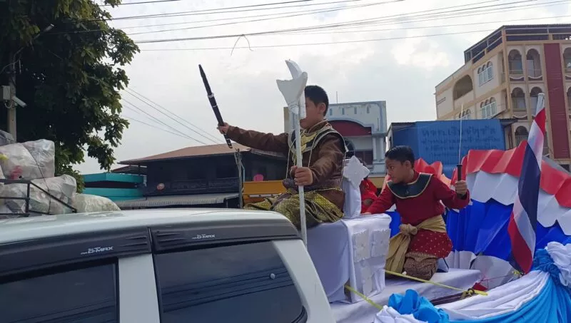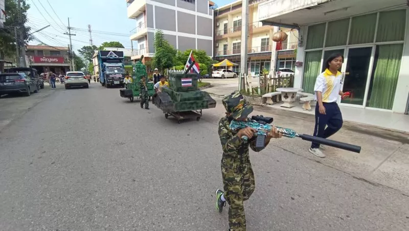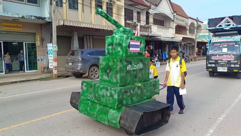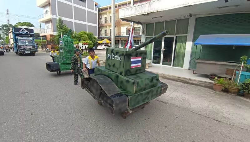 คณะครู ผู้ปครอง โรงเรียนแห่งหนึ่งในอำเภอจัตุรัส พร้อมใจกันแต่งชุดทหาร 3 เหล่าทัพ พร้อมขนยุทธโธปกรณ์ รถถัง เครื่องบิน เรือรบ เปิดเพลงบ้านเกิดเมืองนอน ในขบวนแห่กีฬาสีประจำปี 68 เป็นการส่งเสริมความรักชาติ ให้กับคนไทยโดยเฉพาะเด็กๆเยาวชน