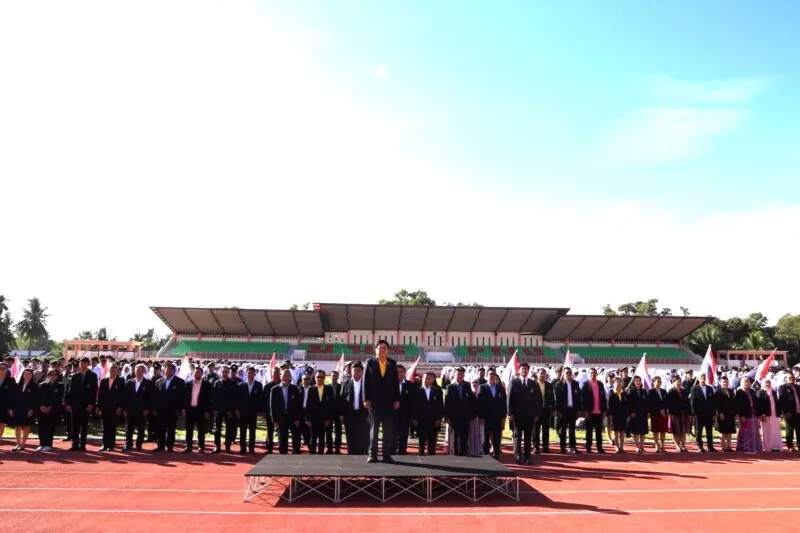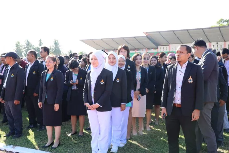 เมื่อเวลา 08.00 น. วันที่ 23 กันยายน 2568 ที่บริเวณสนามกีฬามหาวิทยาลัยนราธิวาสราชนครินทร์ (หน้าเสาธง) ต.โคกเคียน อ.เมือง จ.นราธิวาส มหาวิทยาลัยนราธิวาสราชนครินทร์จัดกิจกรรม “เคารพธงชาติและร้องเพลงชาติไทย” เนื่องในวันพระราชทานธงชาติไทย เพื่อเชิดชูเกียรติธงไตรรงค์ สัญลักษณ์แห่งความเป็นไทย และปลูกฝังจิตสำนึกด้านความรักชาติ ความสามัคคี และความภาคภูมิใจในความเป็นชาติไทย