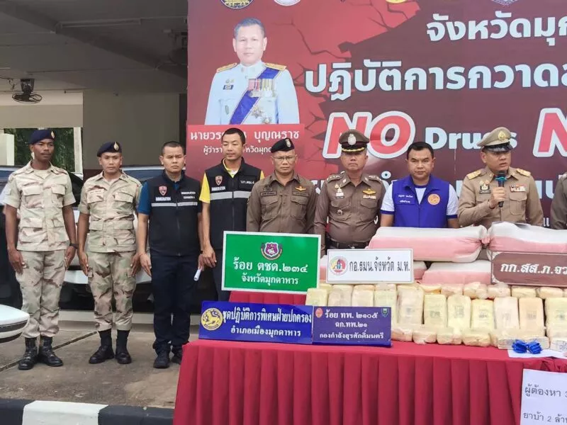 มุกดาหาร – ตำรวจภูธรจังหวัดมุกดาหาร จับกุมยาเสพติดให้โทษประเภท 1 (ยาบ้า) 2,000,000 เม็ด พร้อมผู้ต้องหา 3 คน สารภาพได้ค่าจ้างจำนวน 100,000 บาท เพื่อไปส่งที่จังหวัดสระบุรี รายสำคัญปฏิบัติการสกัดกั้นและปราบปรามยาเสพติด ในพื้นที่ชายแดน ตามนโยบายรัฐบาล สำนักงานตำรวจแห่งชาติ และตำรวจภูธรภาค 4 “Seal Stop Safe ” “No Drugs No Dealers” และ จุดก้าวสกัดจับ P4-Spider Web