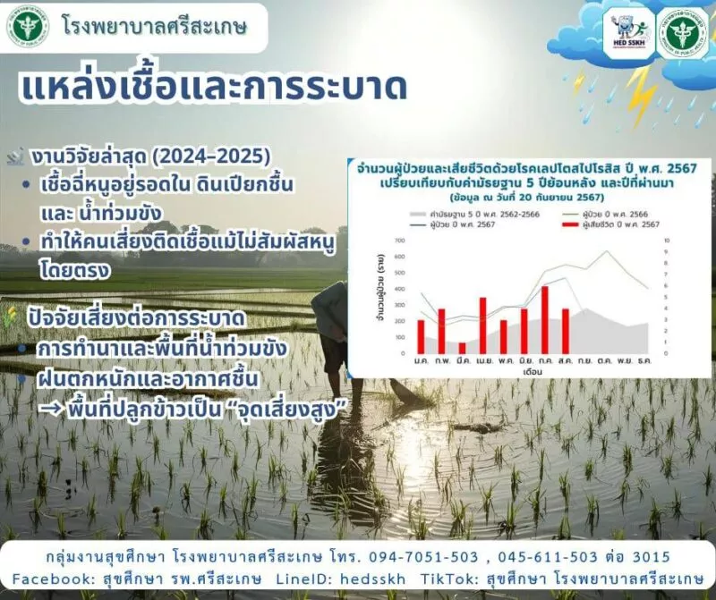 เมื่อวันที่ 2 ต.ค. 2568 นายธวัชชัย แสวงหา นักสาธารณสุข รพ.ศรีสะเกษ เปิดเผยว่า โรคฉี่หนู หรือโรคเลปโตสไปโรซิส รออยู่ทุกก้าว เมื่อฝนตกหนัก น้ำท่วมขังตามทุ่งนาและหมู่บ้าน เชื้อเลปโตสไปโรซิส หรือโรคฉี่หนู แฝงตัวอยู่ในน้ำ ดิน และโคลนชื้น เหมือนศัตรูที่มองไม่เห็น เชื้อเหล่านี้มาจากปัสสาวะของสัตว์ ทั้งหนู สุนัข วัว หรือหมู และรอจังหวะให้ผู้คนสัมผัส การเดินลุยน้ำท่วม การทำงานกลางนา หรือแม้แต่การก้าวลงในโคลนชื้น ทุกก้าวอาจพาเชื้อเข้าสู่ร่างกายผ่านบาดแผลเล็ก ๆ หรือรอยถลอก