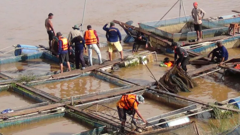 มุกดาหาร – ผู้ประกอบการกระชังปลาริมฝั่งแม่น้ำโขง ร้องให้ทางการเยียวยาและไกล่เกลี่ยความเสียหายผลกระทบจากกระชังปลาขาดไหลไปชนกระซังปลารายอื่น ๆ ได้รับความเสียหายกว่า 7 ราย มูลค่าความเสียหายกว่า 800,000 บาท