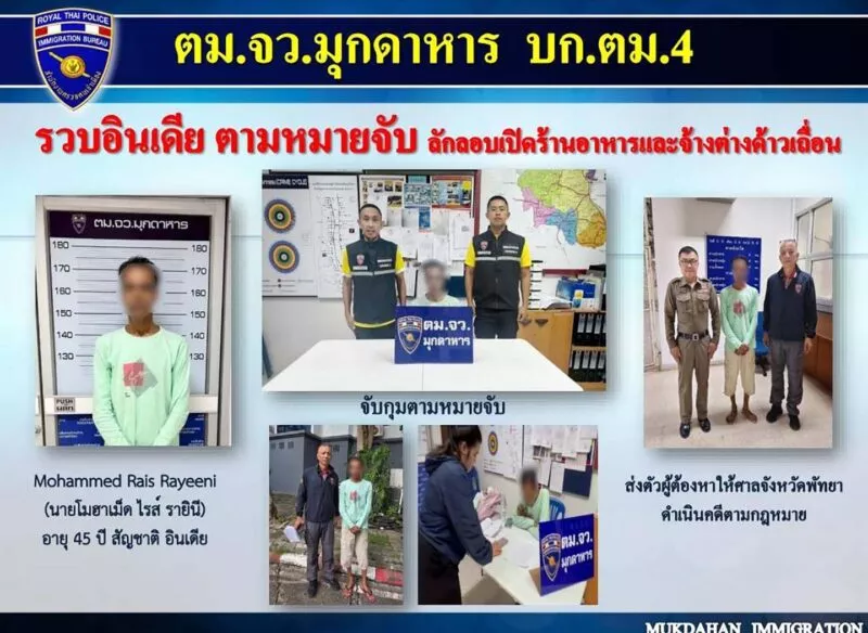 พบว่าเป็นบุคคลต้องห้ามเดินทางเข้าออกราชอาณาจักร จึงได้แจ้งประสานชุดสืบสวนฯ ตม.จว.มุกดาหาร มาตรวจสอบเพื่อดำเนินการเช็คข้อมูลในระบบ CRIMES ผลปรากฏว่า นายโมฮาเม็ด ไรส์ รายินี (Mr.Mohammed Rais Rayeeni) อายุ 45 ปี สัญชาติ อินเดีย ถือหนังสือเดินทางเลขที่ Z8150800 แจ้งที่อยู่ 27/19 หมู่ที่ 10 ต.หนองปรือ อ.บางละมุง จ.ชลบุรี มีหมายจับศาลจังหวัดพัทยา ที่ 712/2568 ลง 16 ตุลาคม 2568 กระทำความผิดฐาน “ร่วมกันรับคนต่างด้าวทำงานโดยที่คนต่างด้าวไม่มีใบอนุญาตทำงานหรือ ให้คนต่างด้าวทำงานนอกเหนือจากสิทธิที่จะทำได้ และร่วมกันขายสุราโดยไม่ได้รับอนุญาต”