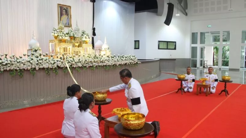 โดยในพิธีเป็นไปอย่างสงบ สง่างาม และเปี่ยมด้วยความอาลัย โดยผู้เข้าร่วมพิธีได้ร่วมกันถวายน้ำสรงพระบรมศพ พร้อมลงนามแสดงความอาลัย เพื่อแสดงออกถึงความจงรักภักดีและสำนึกในพระมหากรุณาธิคุณที่ทรงปฏิบัติพระราชกรณียกิจนานัปการ เพื่อประโยชน์สุขของพสกนิกรทั่วประเทศตลอดรัชสมัย