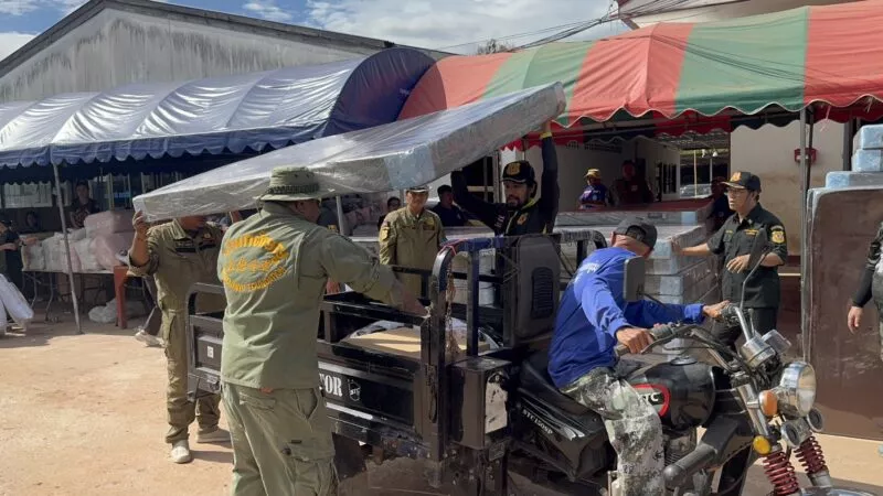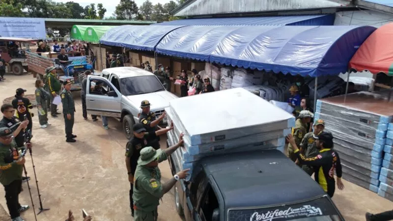 บิณฑ์พร้อมชาวคณะร่วมกตัญญูช่วยแบกที่นอน หมอน ผ้าห่ม เตาแก๊ส หม้อหุงข้าว กระติกน้ำร้อน แจกชาวบ้าน ต.น้ำไคร้ จ.อุตรดิตถ์ 450 ครอบครัว