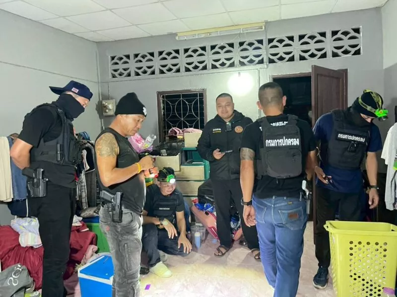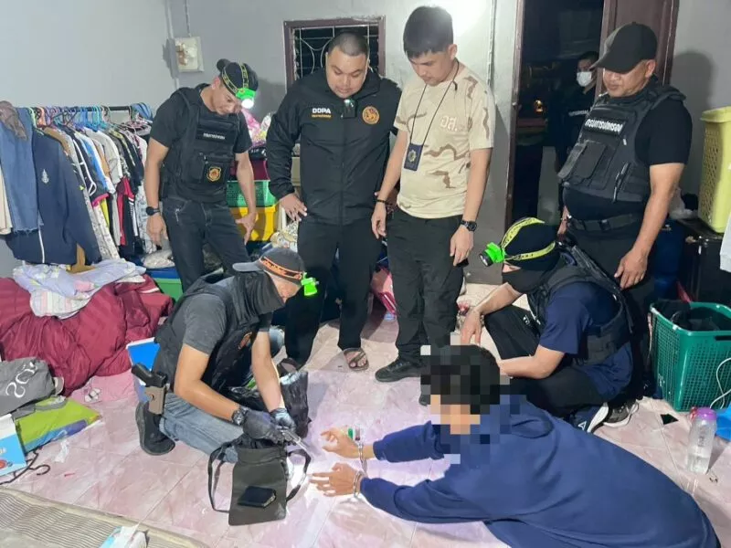 ผู้ต้องหาหลักคือ นายทวีศักดิ์ อายุ 34 ปี ชาวจังหวัดพังงา ซึ่งอยู่ระหว่างหลบหนีหมายจับคดีจำหน่ายยาเสพติด พร้อมของกลาง ยาบ้า 15 เม็ด (บางส่วนพยายามทิ้งลงโถส้วม) และอุปกรณ์เสพยา นอกจากนี้ยังจับกุม นางสาวแสงอรุณ อายุ 20 ปี ผู้ร่วมเสพ และ นายธีรภัทร อายุ 22 ปี พบอาวุธปืนลูกโม่ขนาด .38 ไม่มีทะเบียน กระสุนปืนหลายขนาด รวมถึงยาเสพติด