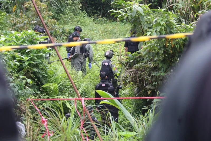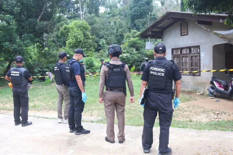 ​พบกองเลือดจำนวนหนึ่งตกอยู่ที่พื้นที่บริเวณหน้าบ้านพัก ซึ่งมีรถ จยย.ยี่ห้อฮอนด้า สีชมพู ทะเบียน 1กช 9626 นราธิวาสจอดอยู่ และจากการตรวจสอบที่บริเวณสวนผลไม้ข้างบ้านพัก เจ้าหน้าที่พบรอยเท้าของคนร้ายเหยียบย่ำต้นไม้และพงหญ้าจำนวนหนึ่งเตียนราบ แต่ไม่พบปลอกกระนุ่นปืนของคนร้ายแต่อย่างใด