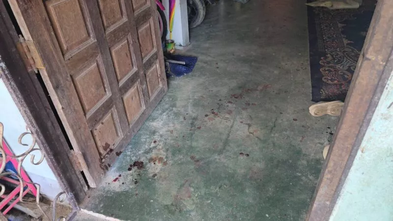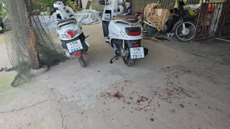 พบชาวบ้านเป็นจำนวนมากยืนจับกลุ่มคุยกัน เจ้าหน้าที่จึงได้กันออกห่างก่อนเข้าตรวจสอบ พบที่บริเวณพื้นหน้าบ้านพักมีคราบเลือดจำนวนหนึ่งตกอยู่ ส่วนรถ จยย.ยี่ห้อฮอนด้า สีขาว ทะเบียน 1กฎ 2921 นราธิวาส ซึ่งจอดอยู่มีคราบเลือดจำนวนหนึ่งติดที่บริเวณไฟเลี้ยวด้านหลัง นอกจากนี้ที่บริเวณประตูหน้าบ้านพักรวมไปถึงภายในบ้าน เจ้าหน้าที่ก็ตรวจพบคราบเนื้อจำนวนหนึ่งตกอยู่เช่นกัน และที่บริเวณใกล้กับเสาไฟฟ้าด้านขวามือของงบ้านพัก เจ้าหน้าที่พบปลอกกระสุนปืนพก ขนาด 9 ม.ม.ตกอยู่จำนวน 2 ปลอก