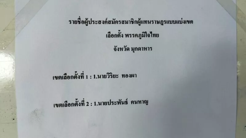 โดยการจัดประชุมครั้งนี้ สมาชิกพรรคภูมิใจไทยได้เข้าร่วมการประชุม Primary Vote เพื่อพิจารณาและให้การรับรอง ว่าที่ผู้สมัครสมาชิกสภาผู้แทนราษฎรแบบแบ่งเขตเลือกตั้ง และแบบบัญชีรายชื่อของพรรคภูมิใจไทย ตามกระบวนการประชาธิปไตยภายในพรรคอย่างโปร่งใส และมีส่วนร่วมจากสมาชิก มีความคิดเห็นตรงกันให้ นายวิริยะ ทองผา เป็นว่าที่ผู้สมัคร ส.ส.เขต 1 จังหวัดมุกดาหาร พรรคภูมิใจไทย และนายประพันธ์ คนหาญ เป็นว่าที่ผู้สมัคร ส.ส. เขต 2 จังหวัดมุกดาหาร พรรคภูมิใจไทย