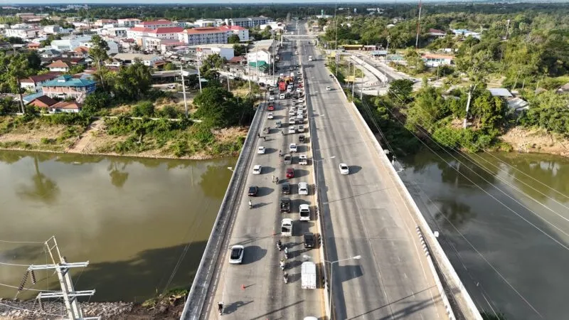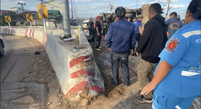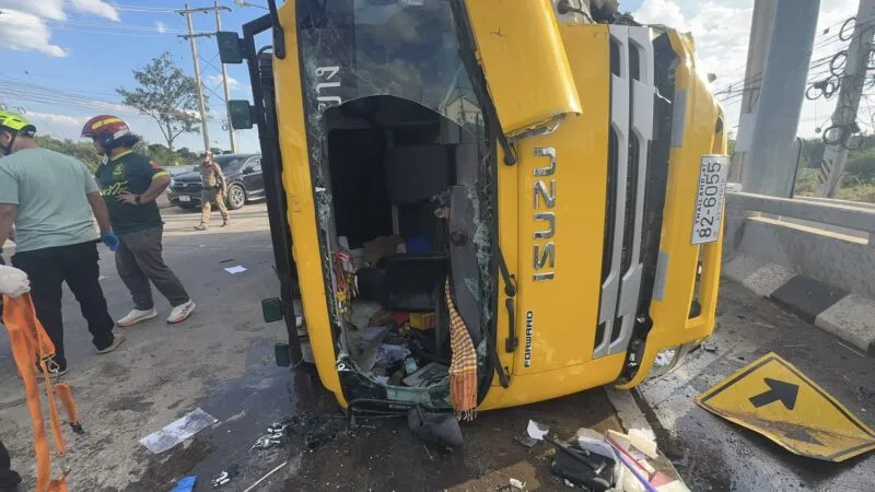 มหาสารคาม – ระทึก  รถขนขยะพลิกคว่ำ บนสะพานข้ามแม่น้ำชีมหาสารคาม