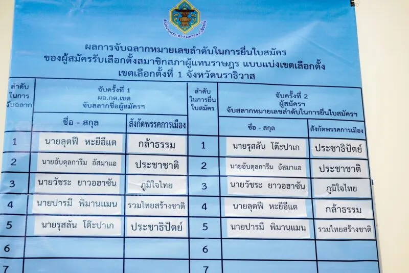 นายนันทพล ภาชื่น ผอ.สนง.คณะกรรมการเลือกตั้งประจำ จ.นราธิวาส ต้องชี้แจงผู้สมัครสมาชิกสภาผู้แทนราษฎรแบบแบ่งเขตทั้ง 5 เขตของ 8 พรรคการเมือง ทำความเข้าใจถึงขั้นตอนต่าง ๆ เพื่อป้องกันการได้เปรียบเสียเปรียบ โดยเจ้าหน้าที่ กกต.ได้เป็นผู้หยิบรายชื่อของผู้สมัครแต่ละพรรคการเมืองและของแต่ละเขต ใส่ในภาชนะใสเพื่อความโปร่งใสและป้องกันการทุจริต หลังจากนั้นจะใช้รายชื่อของแต่ละพรรคการเมืองว่า ใครเป็นผู้ได้หยิบฉลากหรือเบอร์อะไร เพื่อใช้เป็นเบอร์ประจำตัวในการหาเสียงเลือกตั้งในครั้งนี้ ซึ่งเจ้าหน้าที่ต้องใช้เวลานานกว่า 1 ช.ม. จึงจะแล้วเสร็จ พร้อมทั้งให้ผู้สมัครของแต่ละพรรคการเมือง ทำการสมัครกับเจ้าหน้าที่ กกต. ซึ่งถือว่าเป็นจังหวัดหนึ่งที่ต้องใช้เวลานาน