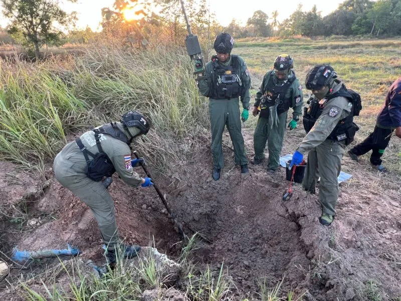 ร.ต.อ.ธีรภัทร นามมั่น หัวหน้าชุดเก็บกู้และทำลายวัตถุระเบิด (EOD กก.ตชด.22) เผยว่า ในวันนี้หลังจากที่ได้รับแจ้งจากชาวบ้าน ตนเองพร้อมทีมงานได้รีบลงพื้นที่มาตรวจสอบทันทีก่อนจะพบว่า ระเบิดยังทำงานไม่สมบูรณ์ จากการตรวจสอบพบว่า เป็นลูกกระสุนปืนใหญ่ขนาด 105 มิลลิเมตรก่อนจะได้มีการขุดและนำไปทำลายเป็นที่เรียบร้อยแล้ว และฝากในช่วงนี้ถ้าหากชาวบ้านได้ยินเสียงคล้ายกับเสียงปืน ขอให้ไม่ต้องตกใจเป็นเพียงเสียงของการทำลายวัตถุระเบิดของเจ้าหน้าที่อีโอดีในฝั่งไทยเท่านั้น และถ้าหากมีการพบเจอวัตถุต้องสงสัยก็ให้รีบแจ้งทางผู้นำชุมชน ทหารหรือแจ้งมาที่เจ้าหน้าที่อีโอดีได้โดยตรงต่อไป.