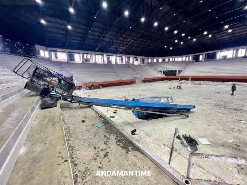 ที่ เกิดเหตุพบรถกระเช้าบูมลิฟท์ ยี่ห้อ Genie รุ่น Z-80/60 น้ำหนักประมาณ 10–17 ตัน ตกลงจากชั้น 2 ลงสู่ชั้น 1 โดยส่วนกระเช้าพาดคาอยู่บริเวณอัฒจันทร์ ใกล้กันพบผู้บาดเจ็บ 2 ราย ทราบชื่อภายหลังคือ น.ส.สุวลี ทัพไทย อายุ 27 ปี และ นายศราวุธ กาญจนัส อายุ 32 ปี ชาว อ.บรรพตพิสัย จ.นครสวรรค์ ทั้งสองเป็นสามีภรรยากัน อยู่ในสภาพหมดสติ ไม่มีชีพจร และมีบาดแผลฉกรรจ์ เจ้าหน้าที่พยายามปั๊มหัวใจช่วยชีวิตก่อนนำส่งโรงพยาบาลตรัง แต่ทั้งคู่เสียชีวิตในเวลาต่อมา