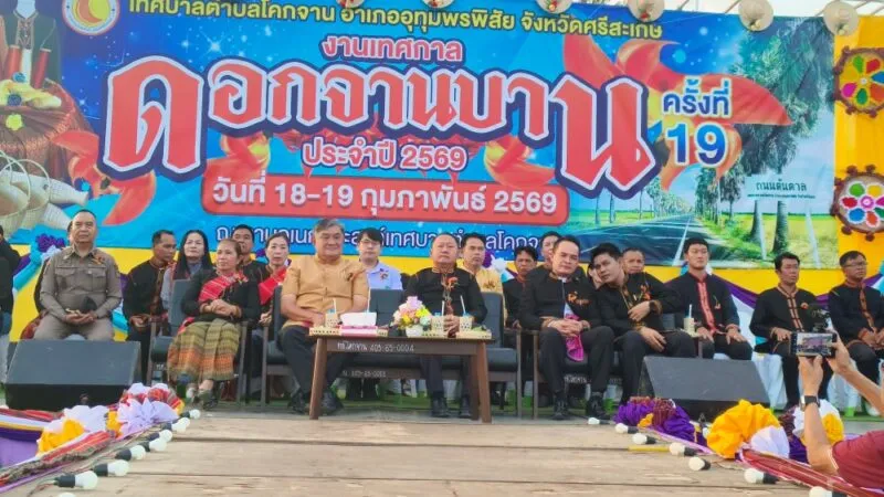 เมื่อวันที่ 18 กุมภาพันธ์ 2569 ที่ลานอเนกประสงค์เทศบาลตำบลโคกจาน อ.อุทุมพรพิสัย จ.ศรีสะเกษ นายสุกิจ เหลืองสกุลไทย รองผู้ว่าราชการจังหวัดศรีสะเกษ เป็นประธานลั่นฆ้องเปิดงานเทศกาลดอกจานบาน ครั้งที่ 19 และโครงการตลาดนัดท้องถิ่นสีเขียว โดยมีนายพศิน ทาสิริ นายอำเภออุทุมพรพิสัย และนายนิรุตย์ เกษกุล นายกเทศมนตรีตำบลโคกจาน นำหัวหน้าส่วนราชการอำเภออุทุมพรพิสัย สมาชิกสภาเทศบาลตำบลโคกจาน กำนัน ผู้ใหญ่บ้าน และพี่น้องประชาชนในพื้นที่เทศบาลตำบลโคกจาน เข้าร่วมในพิธีเปิดงานเทศกาลดอกจานบานในครั้งนี้เป็นจำนวนมาก