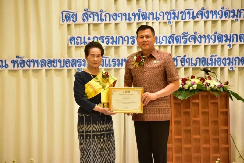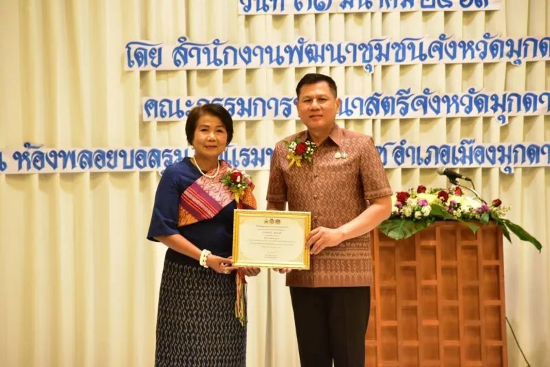โอกาสนี้ ผู้ว่าราชการจังหวัดมุกดาหารได้มอบใบประกาศเกียรติคุณแก่สตรีดีเด่น พร้อมกล่าวเปิดงานและให้โอวาทแก่ผู้เข้าร่วมโครงการ เพื่อเป็นแนวทางในการพัฒนาศักยภาพสตรี และขับเคลื่อนการพัฒนาชุมชนให้เกิดความเข้มแข็ง​อย่างยั่งยืนต่อไป