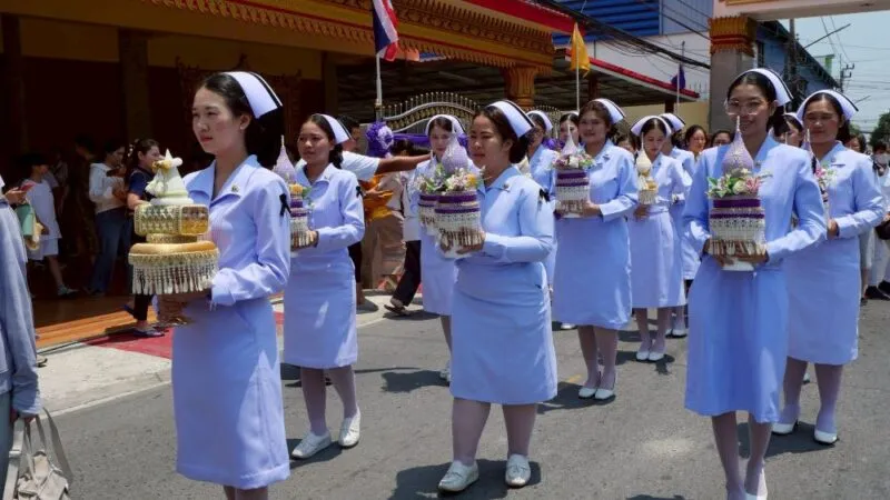 ต่อมาเวลา 12.00 น. มีพิธีแห่นาคเข้าสู่อุโบสถ โดยได้รับเมตตาจาก พระธรรมสุธี ที่ปรึกษาเจ้าคณะภาค 1 เจ้าอาวาสวัดหัวลำโพง พระอารามหลวง เป็นพระอุปัชฌาย์ มีคณะญาติ พ่อนาคแม่นาค ข้าราชการ พยาบาล ข้าราชการครู เข้าร่วมขบวนแห่ ในการนี้ พระวชิรคณาทร “เจ้าคุณแจ้” เจ้าอาวาสวัดบางพลีใหญ่กลาง ประธานจัดงาน จัดเต็มในการโปรยทาน กว่า 300,000 บาท ให้กับญาติโยมที่มาร่วมบุญ บรรยากาศเป็นไปด้วยความคึกคัก