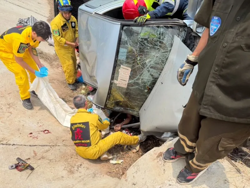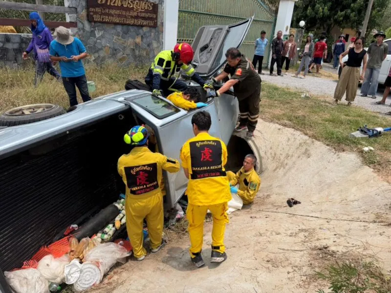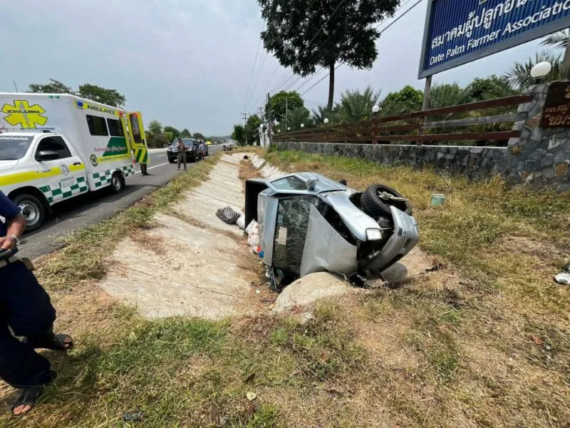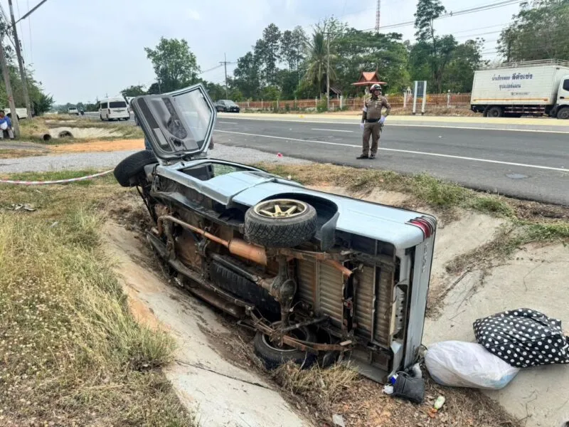 หลับใน!! กระบะขนคนจะไปเยี่ยมญาติ เสียหลักลงข้างทาง คนขับดับคาที่ บาดเจ็บ 5 ราย