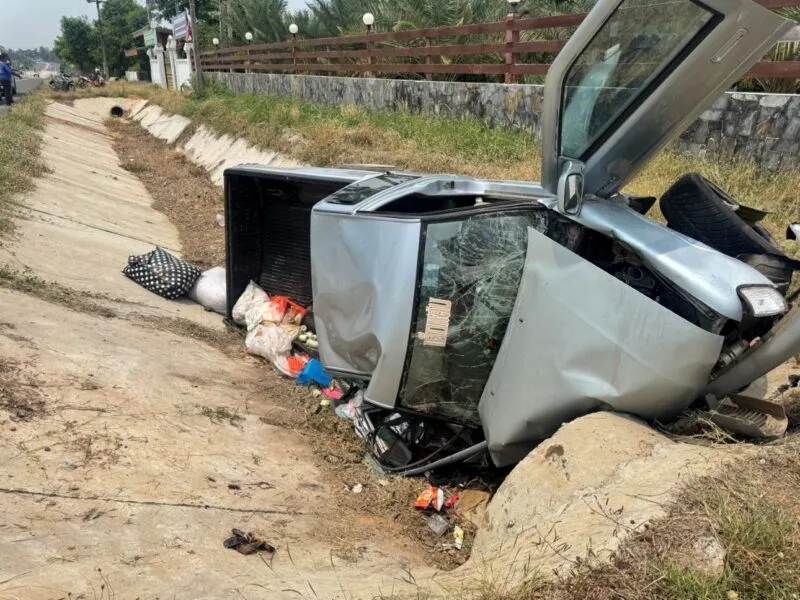 มหาสารคาม – หลับใน!! กระบะขนคนจะไปเยี่ยมญาติ เสียหลักลงข้างทาง คนขับดับคาที่ บาดเจ็บ 5 ราย