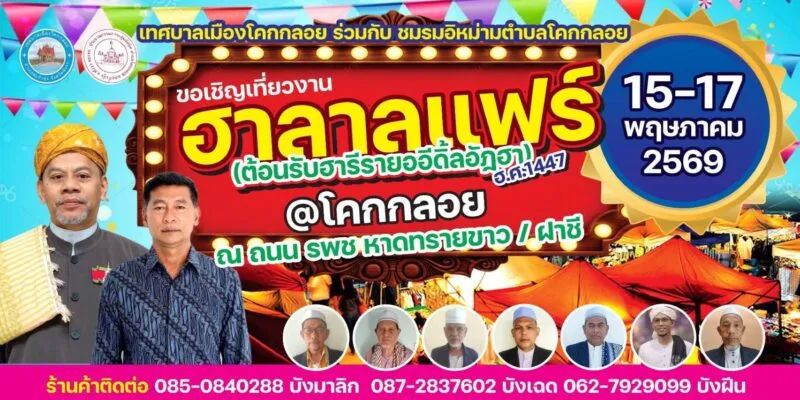 งาน โคกกลอย ฮาลาลแฟร์ 2026 กำหนดจัดขึ้นระหว่างวันที่ 15 – 17 พฤษภาคม 2569 ที่ บริเวณ ถนน รพช. หาดทรายขาว/ฝาชี ต.โคกกลอย อ.ตะกั่วทุ่ง จ.พังงา ขอเชิญชวนประชาชนและนักท่องเที่ยวร่วมสัมผัสเสน่ห์วิถีฮาลาล อุดหนุนสินค้า และร่วมเป็นส่วนหนึ่งในการส่งต่อโอกาสทางการศึกษาให้กับเยาวชนไทยไปพร้อมกัน.